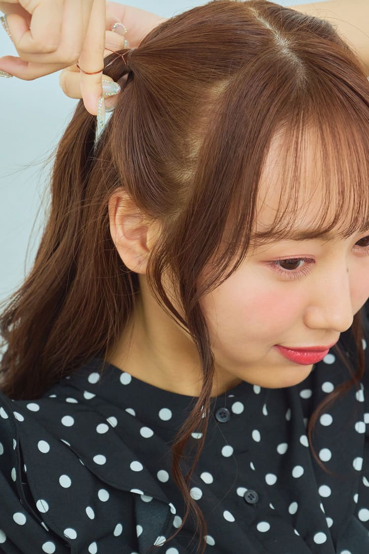 耳の上の髪をとり分け、後ろに引っ張るようにゴムで結んでね。