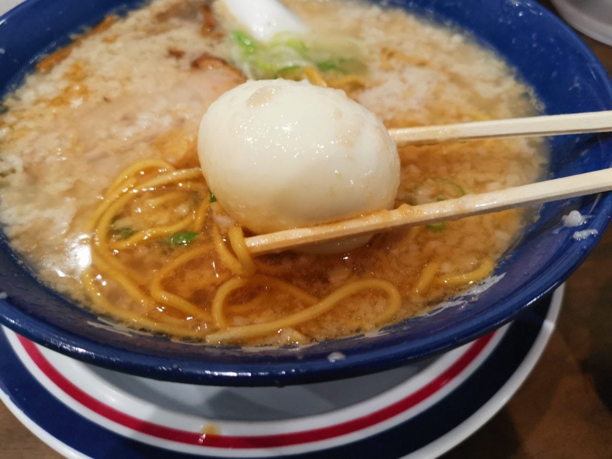 そして環七ラーメンの特徴のひとつ、味玉ではなく普通の茹で卵もトッピング可能。ワイルドにひとつドボンと入っているところがちょっと懐かしくて良い。