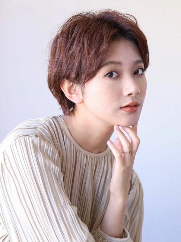 センターで髪を分けているショートヘアのため、小顔効果も期待できますよ。