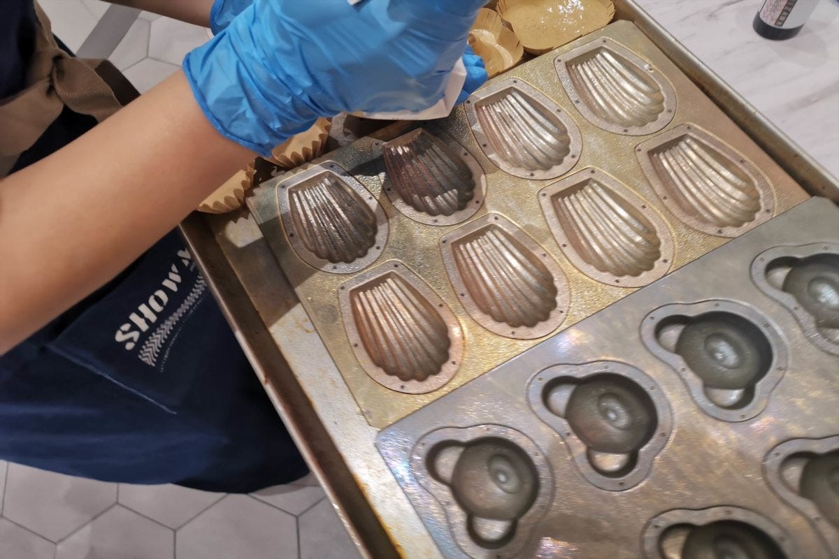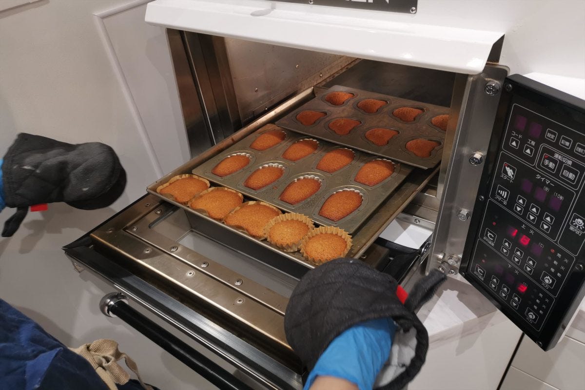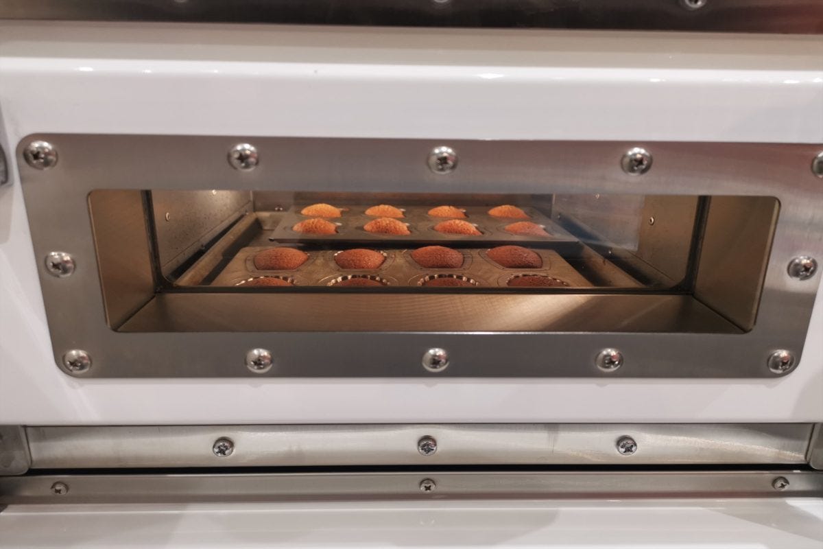 フィナンシェの生地をCHIYODA型に流し込み、オーブンに入れて焼けるのを待つ。「petit BACKEN」には庫内に照明を点けられる機能もあり、焼け具合が途中で見られるのも良いところだ。
