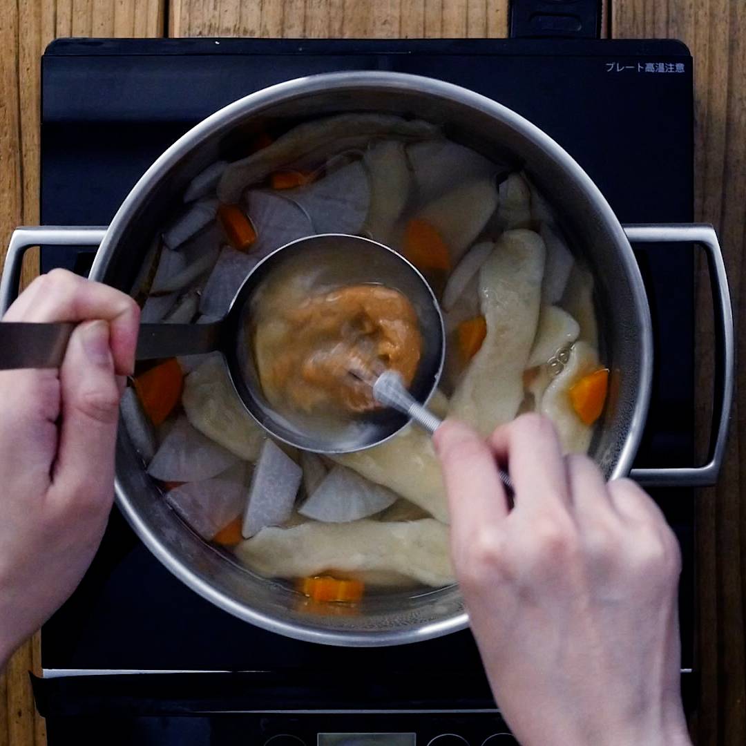 だんごが浮き上がり、透明感が出てきたら、みそを溶かし入れます。器に盛り付け、小口ねぎをのせて完成です。
