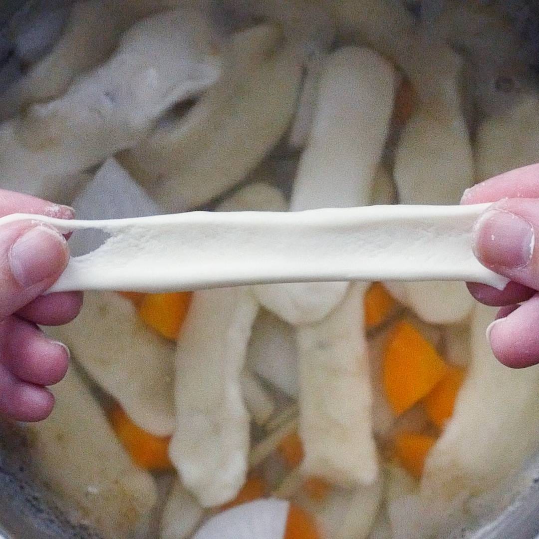 火が通ったら、だんごをひと口大にちぎり引っぱって麺状にのばします。鍋に入れて煮込みます。