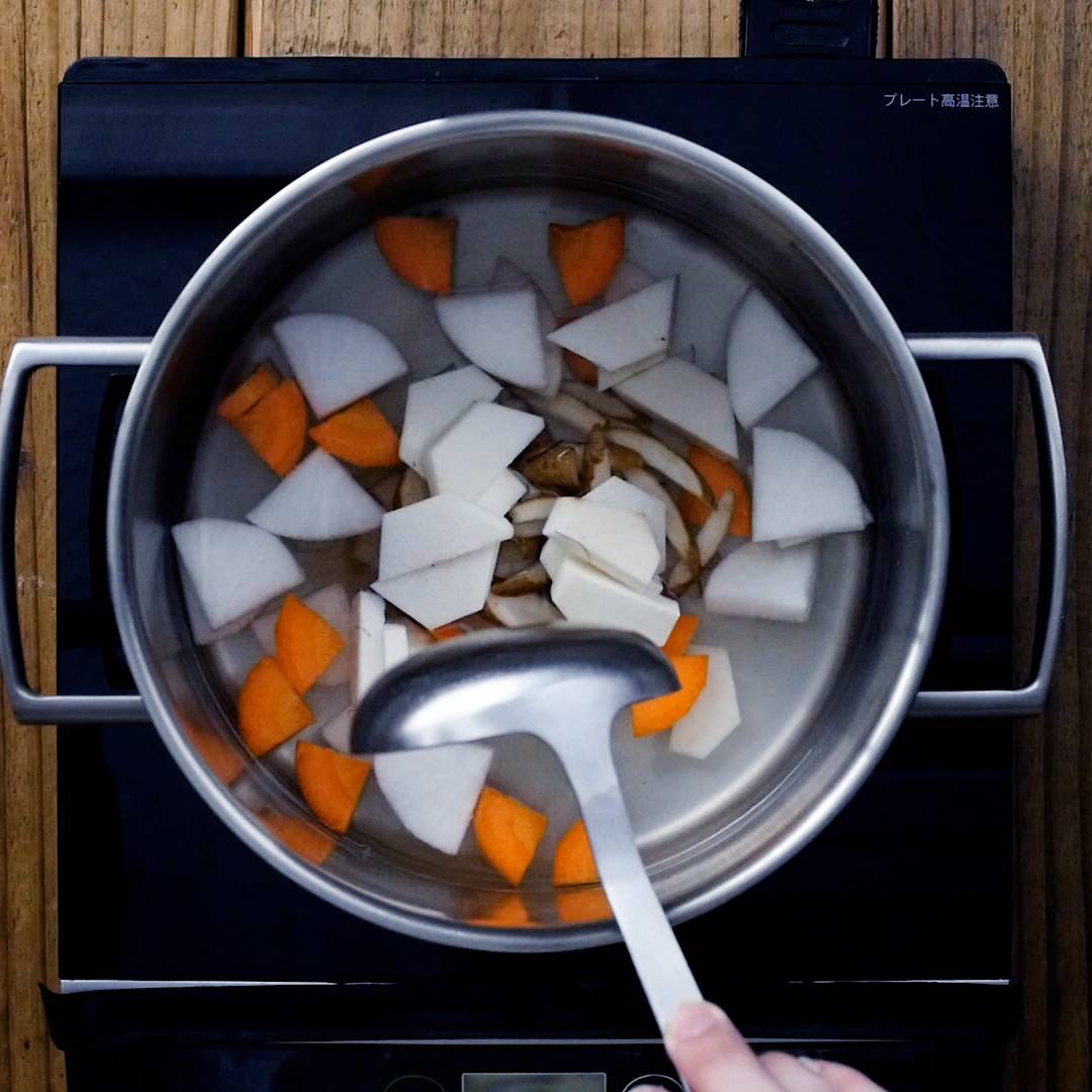 鍋に水、だしの素、ごぼう、にんじん、大根、里芋を入れて煮込みます。
