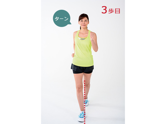●3ターン…3歩目はうしろ足で地面をぎゅっと蹴り、通常より手の人さし指1本分(約8cm)だけ、右足の歩幅を広げて「ターン」と踏み出す。
