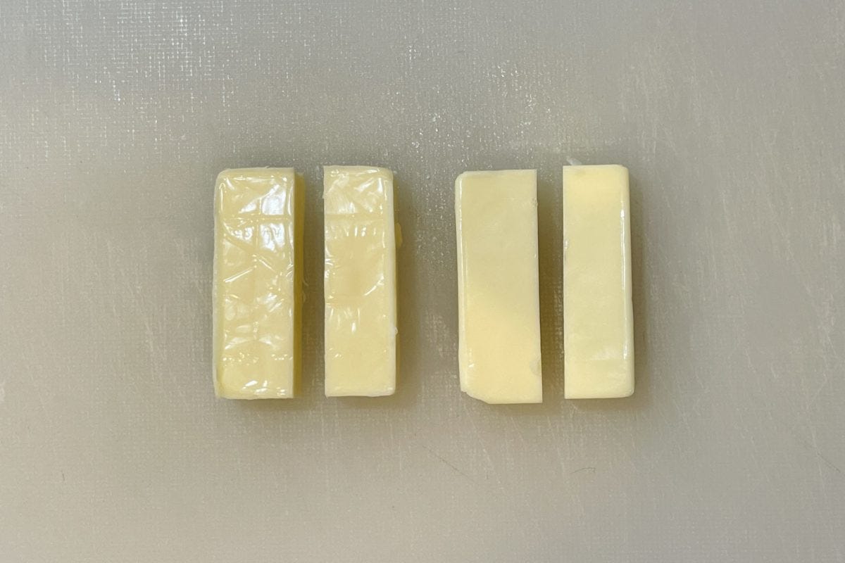 次に豚バラ巻きを作っていきます。プロセスチーズを半分に手で半分に割くor 包丁でカット。