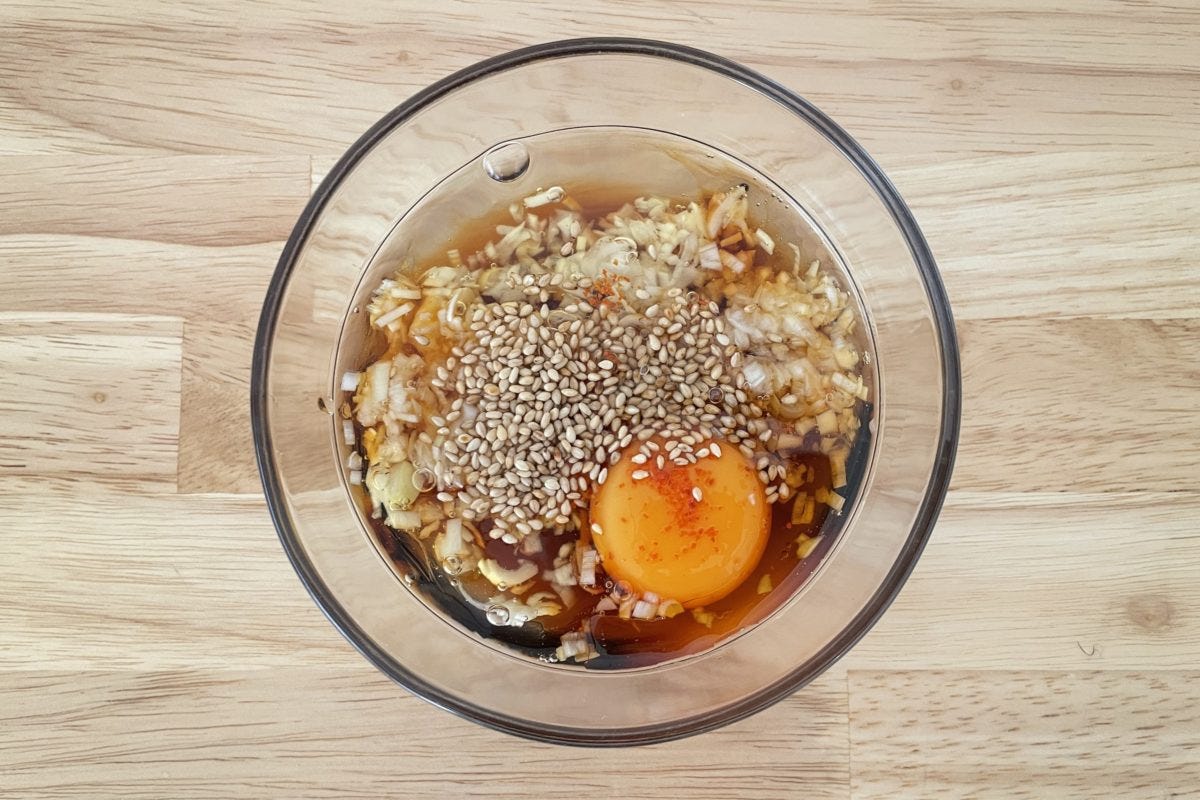 切ったネギ、生卵(1個)、ポン酢(大さじ3)、ごま油(小さじ1/2)、一味唐辛子(適量)、炒りごま(適量)を器に入れたらタレは完成です!