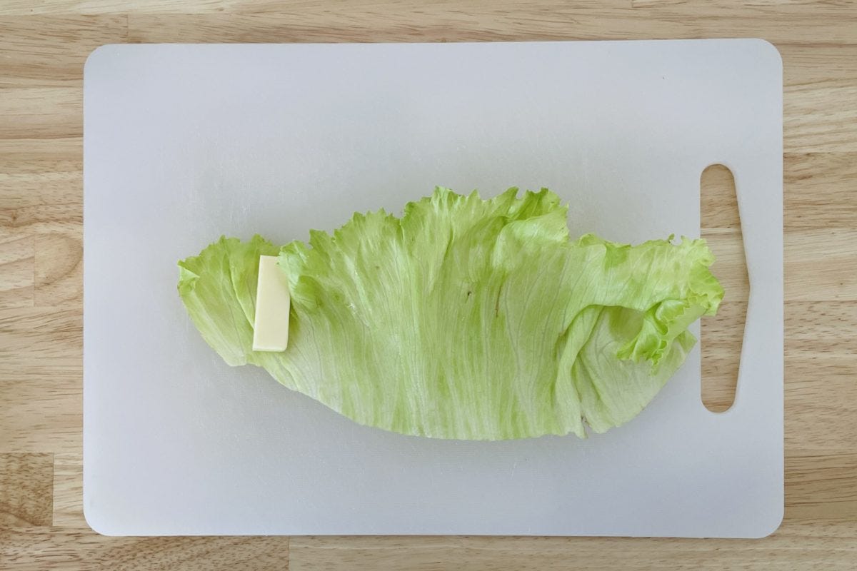 レタスを軽く水洗いしたら茎の部分にチーズを置き、レタスの繊維と同じ方向の縦に巻いていきます。そうすることでレタスが割れづらく包みやすいとのこと。
