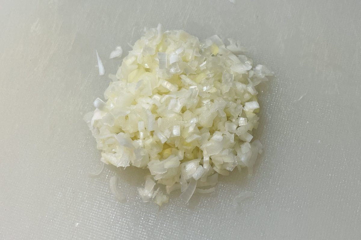 まずはタレを作っていきます。長ネギの下の部分を回転させながら5cmほど切り込みを入れ、みじん切りに。