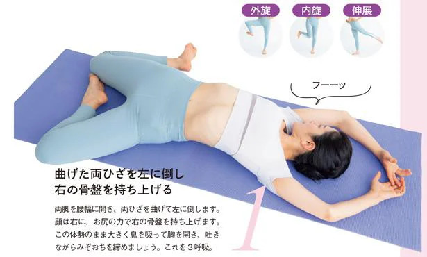 1. 曲げた両ひざを左に倒し右の骨盤を持ち上げる