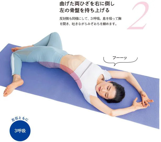 両脚を腰幅に開き、両ひざを曲げて左に倒します。顔は右に、お尻の力で右の骨盤を持ち上げます。この体勢のまま大きく息を吸って胸を開き、吐きながらみぞおちを締めましょう。これを3呼吸。