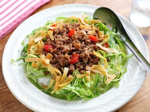 タコスのそぼろは事前に準備しておけば、当日は盛り付けるだけでよいので手抜きでも豪華な一皿ができますよ。