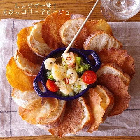 こちらはレンジで手抜き調理できる簡単アヒージョ。えびとブロッコリーがカラフルで、パーティー料理に彩りを添えてくれますよ。