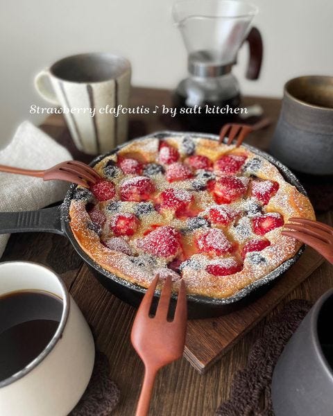 こちらはスキレットを活用したクラフティ。プリンのようなケーキのような味わいのクラフティは、子供から大人まで人気のあるレシピです。