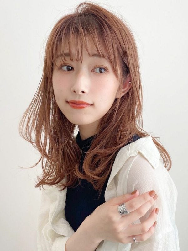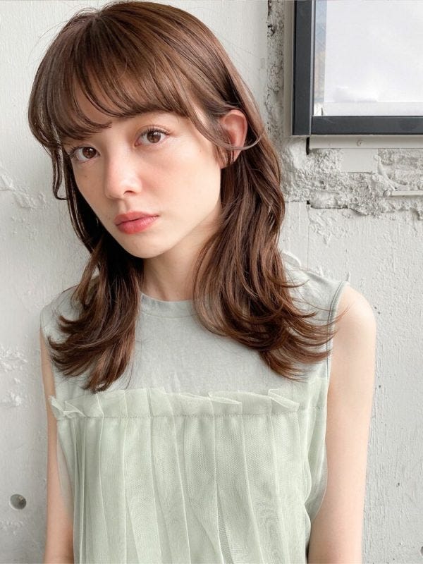 同じ長く伸びた前髪部分やサイドにレイヤーを入れたセミロングも、ゆるふわのウェーブとドライな質感のスタイリングなら大人可愛い雰囲気の髪型が作れますよ。