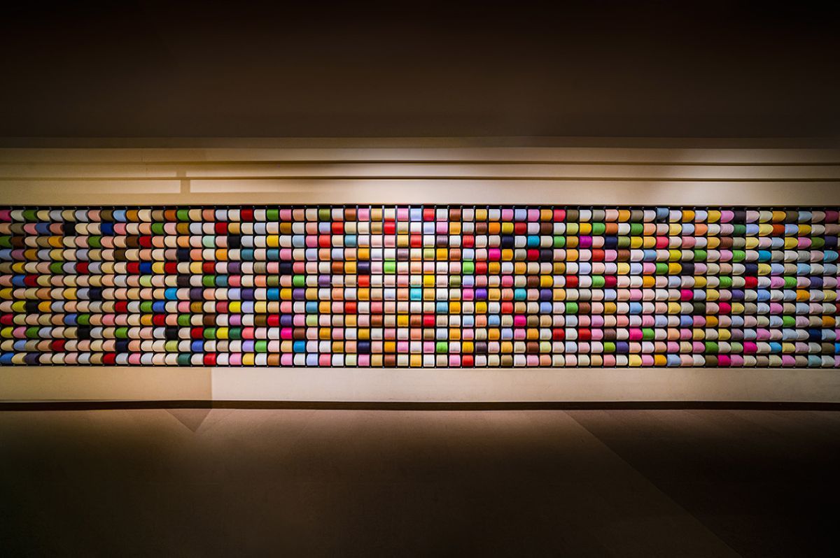 壁一面をカラフルに彩っているのは、タオルの原料となる糸巻です。約200色・1800本の巻糸がずらりと並ぶ光景は、まるで美しいモザイクアートのよう。「チーズ糸巻の壁」と名付けられたこちらのコーナーは、フォトスポットとして人気を集めています。