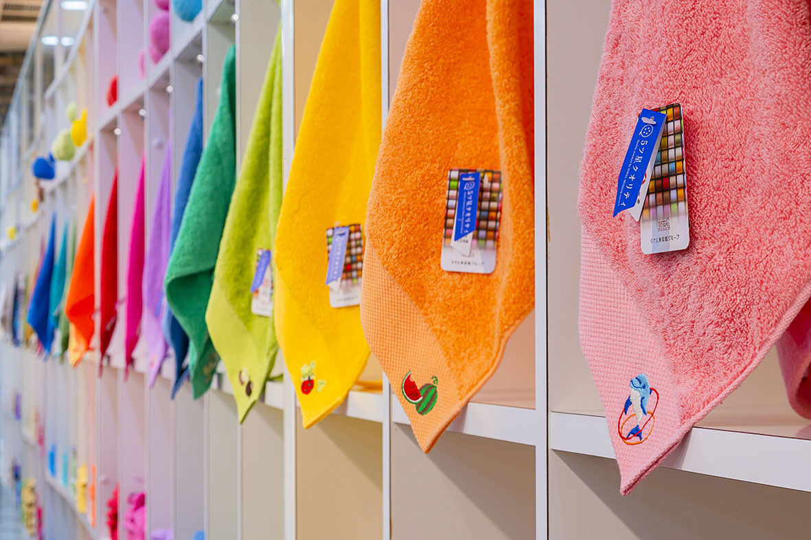 美術館オリジナル商品のなかでもおすすめは、「カラーパレット40色タオル」。その名の通りバリエーション豊富なカラー展開で、暮らしに彩りを添えてくれるアイテムです。サイズはフェイスタオルやバスタオルなど4種類。グッドデザイン賞を受賞した「5ツ星クオリティ」製法で作られているので、環境にも優しく、ふっくら優しい肌触りが魅力です。ショップ内にあるタオル工房では、購入したタオルに名前を刺繍してくれるサービス(1文字33円)もあるので、オリジナルタオルをおみやげにするのも良いですね。