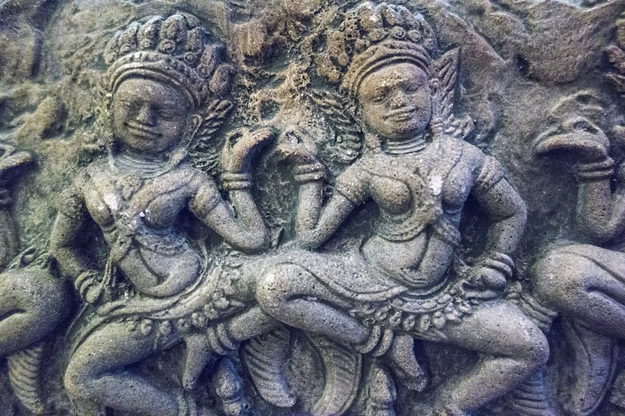 廊下や壁面に施され、自然と調和した彫刻はクメール芸術の傑作と称えられています。