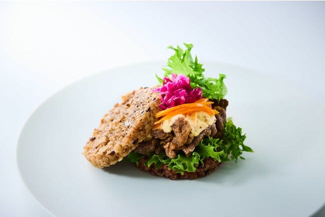 「寝かせ玄米」を香ばしく焼き上げたライスのバンズで、焼肉のタレを絡めて焼いたグラスフェッドビーフ(牧草牛)、野菜のナムルと酢漬けを挟んだ満足感のある一品。