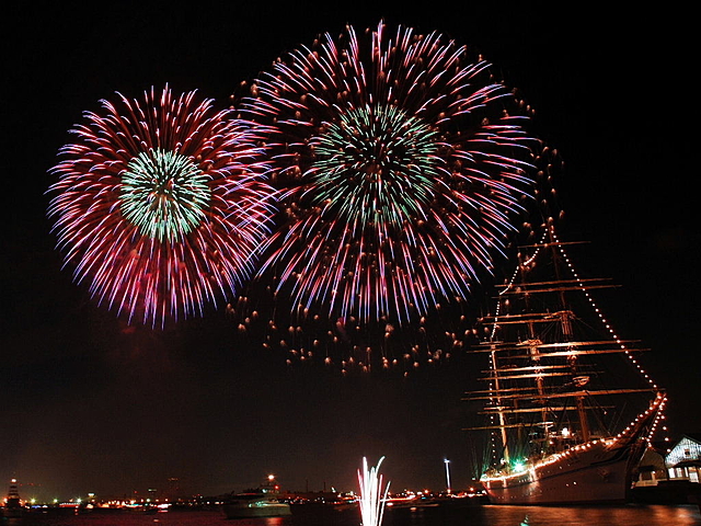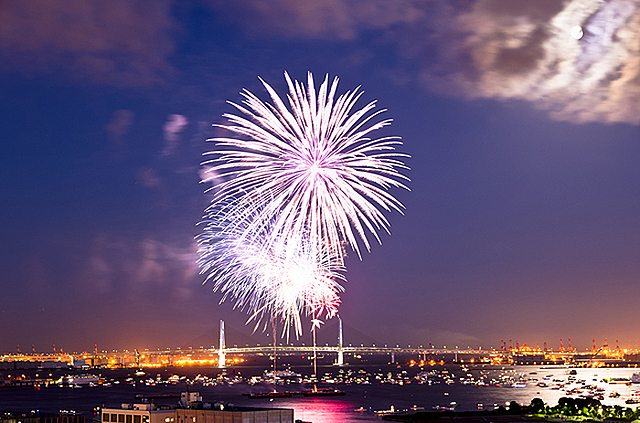 夜の横浜港が大輪の花火で彩られます。打ち上げ花火のほか、レーザー光線による演出で、「光」「音」「水」「花火」の華麗なショーが楽しめます。
