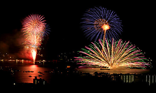 海上から移動する船で、打ち上げる水上花火は、半円扇子状に開き、みごとです。