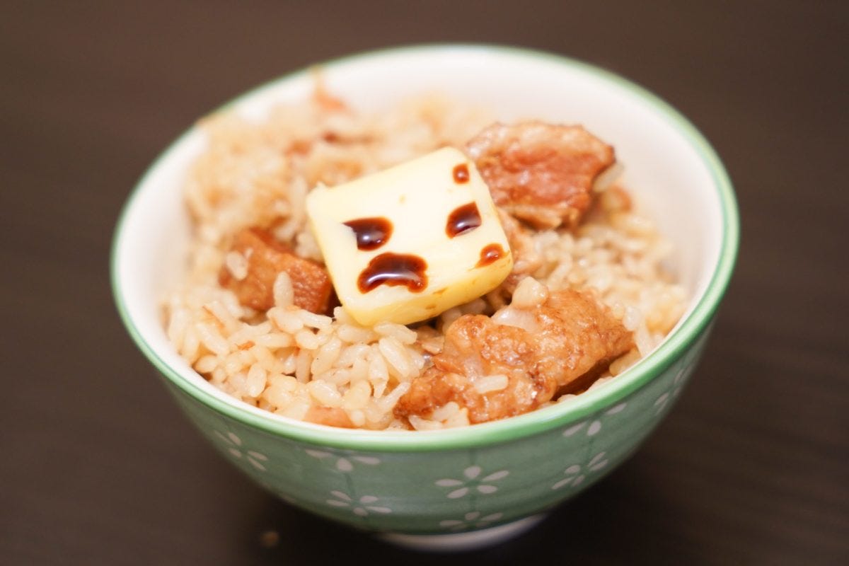塩胡椒で味を調整した後、茶碗によそりバターと醤油をトッピングすれば完成だ。溶かしたバターをあえて、一口頬張ると...めっちゃくちゃ美味い...!