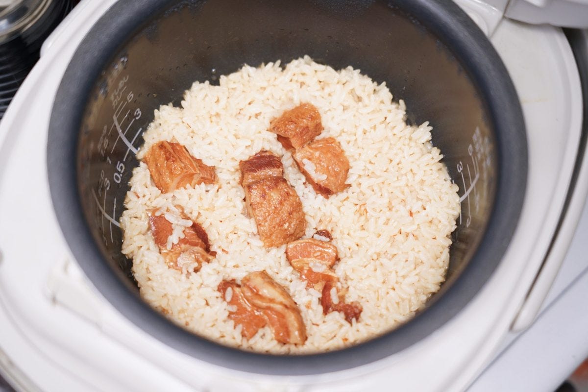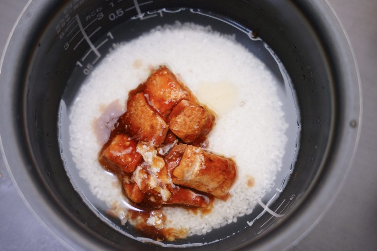 まずは、米1合を研いだら水180mlを注ぎ30分浸す。浸水させた米に金の豚角煮とチューブにんにくを加えたら普通モードで炊いていく。