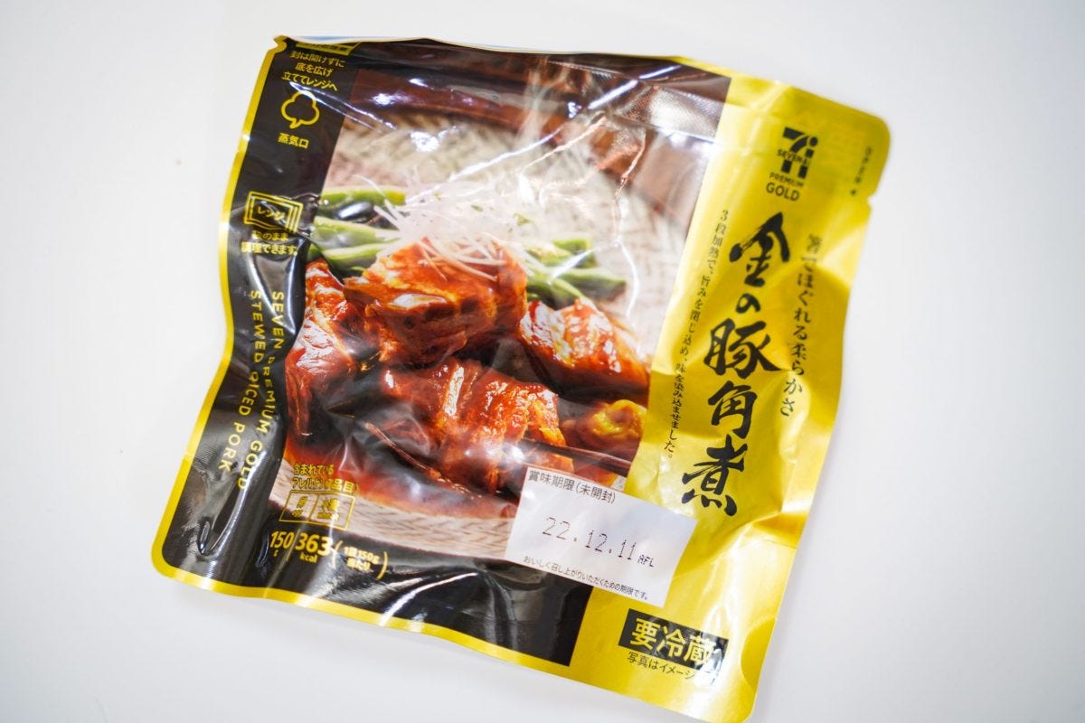 使用するのは、柔らかくも旨味たっぷりの『金の豚角煮』(429円)。そのほかの材料は米(1合)、チューブにんにく(小さじ1)、バター(5g)、塩・胡椒・醤油を少々だ。