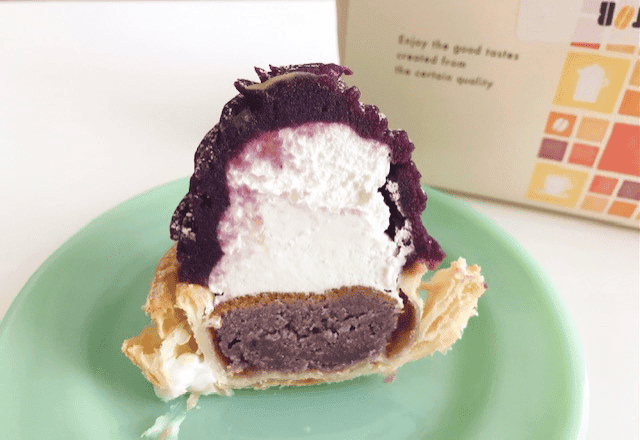 紅芋クリームに中はホイップクリーム、底は紅芋タルトにパイ生地とこちらもとても綺麗な断面!