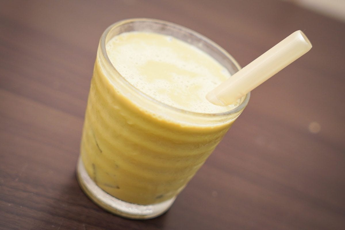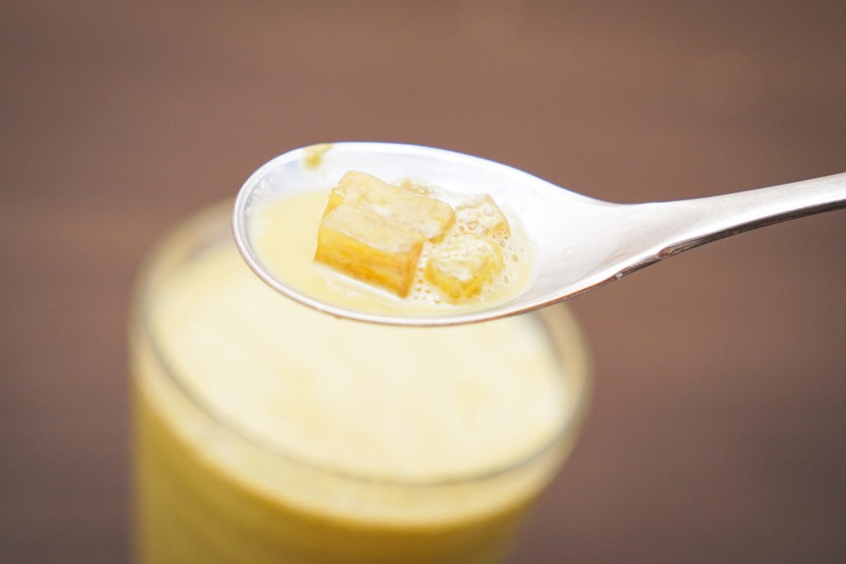わらび餅はぷるん、つるんとした食感で、とろけるというよりはほろりと崩れる印象だ。ストローが太いためガブガブと飲むことができるのも最高だ。
