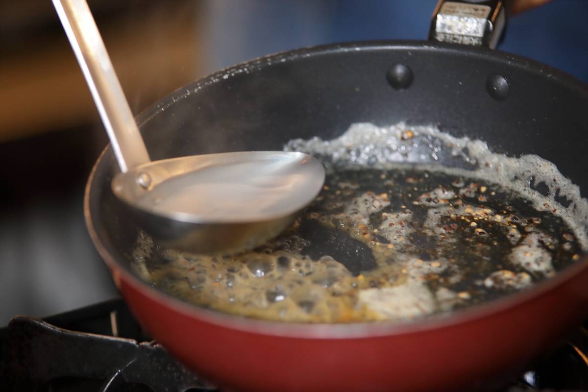 バターがキツネ色に焦げはじめて泡がフツフツしなくなったら、パスタのゆで汁70ccを加えます。ゆで汁でソースを伸ばし、火を止めます。