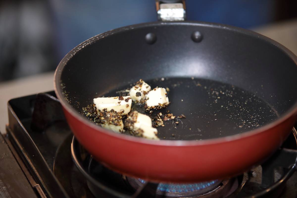 2のフライパンにバター20gを入れます。弱火にかけて、バターをゆっくりと溶かしながら焦がします。 「バターにこしょうの香りをまとわせるようなイメージで、バターを溶かしていきます」