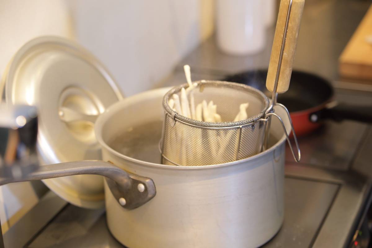 1Lの水に塩10g(分量外)を入れて火にかけ、沸騰したらパスタを加えてゆでます。 「パスタは表示よりも1、2分短めにゆでてください」