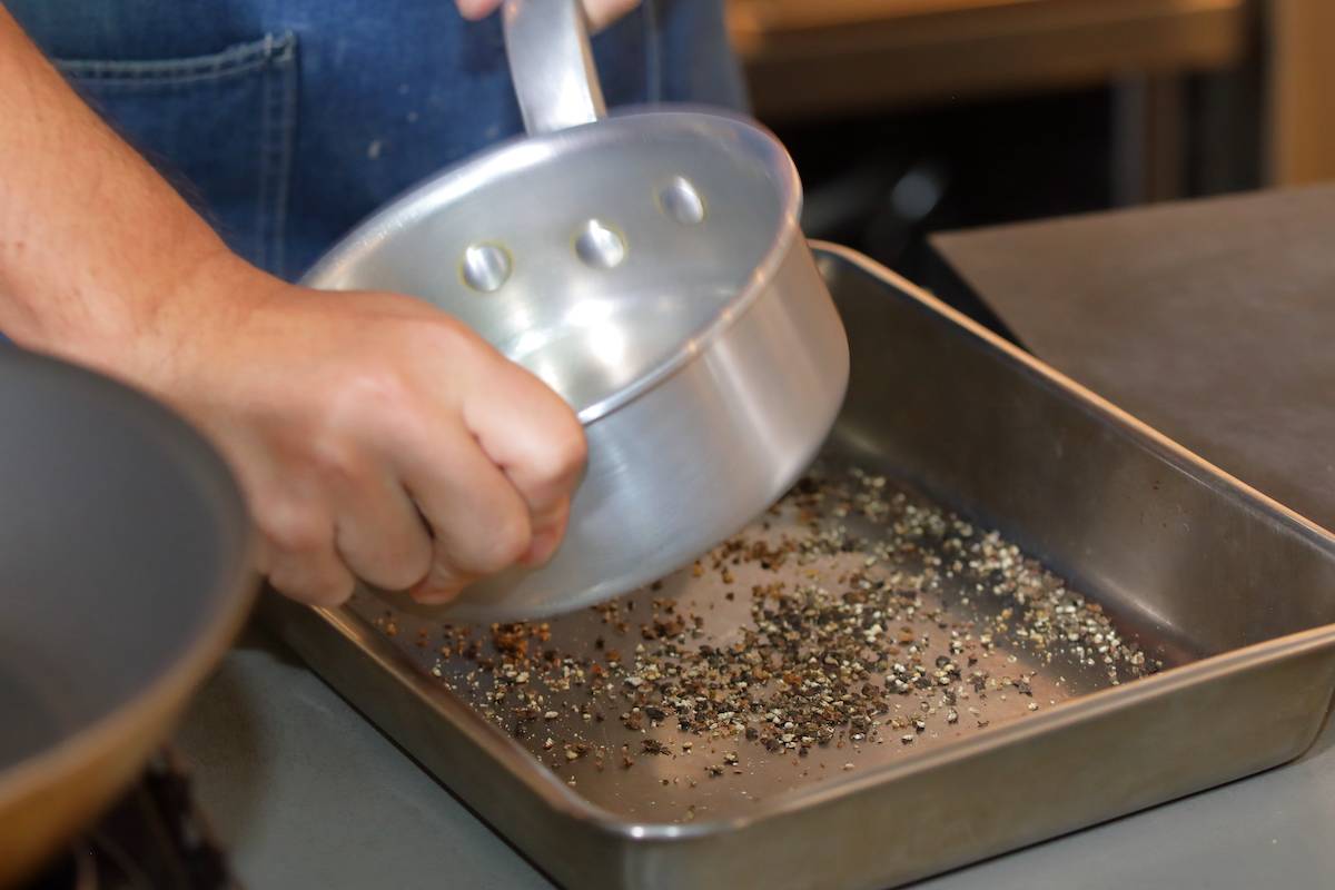 黒こしょうをフライパンに入れて、弱火で乾煎りします。香りが出てきたら火を止め、仕上げ用に半分取り分けておきます。 「乾煎りするのは、黒こしょうの水分を飛ばすため。炒ることでこしょうの香りが強くなるんです」