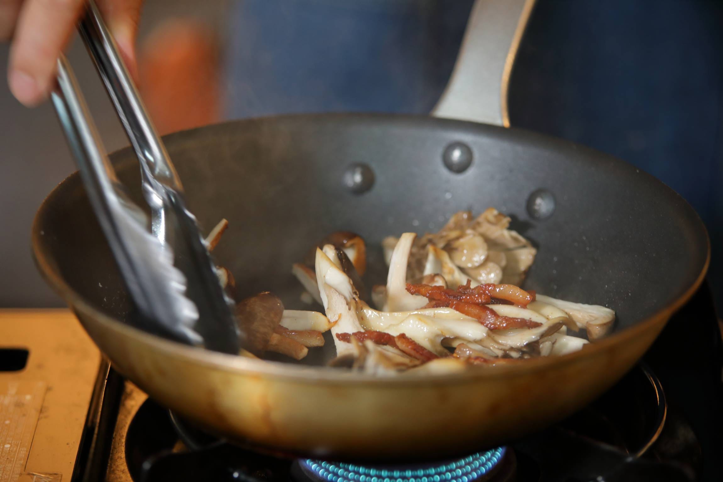 フライパンにオリーブオイルを引き、ベーコンを炒めます。ベーコンがカリッとしてきたらきのこを加えて塩をします。こんがりと色付くまで炒め、火を止めます。