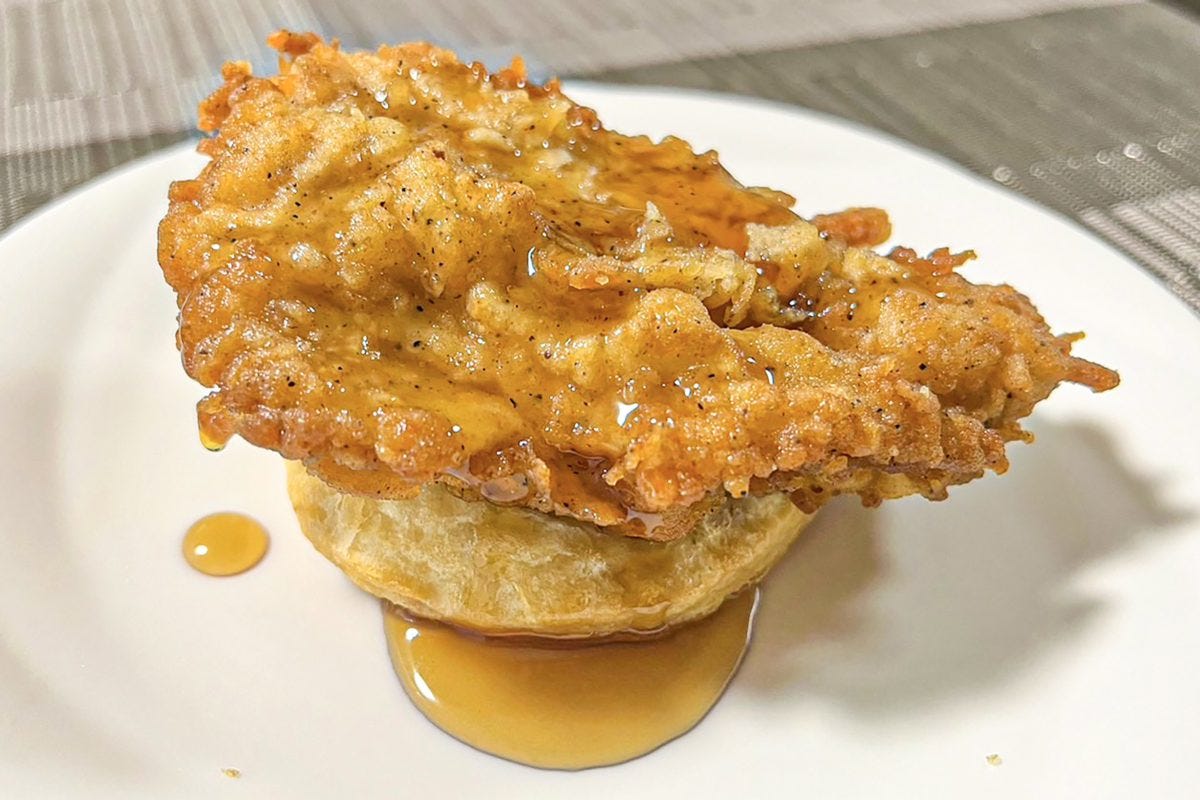 こちらが完成した『ビスケット×骨なしケンタッキー~ハニーメイプルを添えて~』だ。ビスケットのバターの香りとともに、メイプルシロップのおいしそうな匂いが漂ってくる。