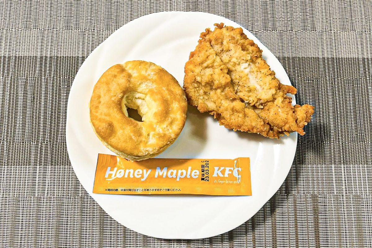 いざ一口食べてみると...めちゃくちゃウマい! 骨なしケンタッキーの塩っけとハニーメイプルの濃厚な甘さが相性抜群。噛めば噛むほど旨味が溢れ出してくる。