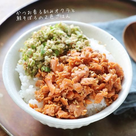 こちらはオクラの緑と鮭のピンク色が華やかな、ご飯がすすむ2色そぼろ丼です。