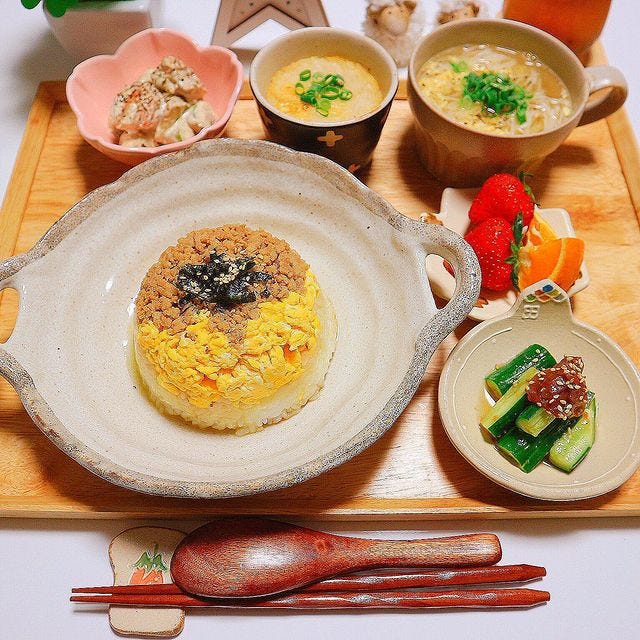 大きめの茶碗に2色のそぼろを半分ずつ入れてからご飯を詰めてお皿の上でパカッとひっくり返すと、可愛いドーム型になって子供も喜んで食べてくれるでしょう。