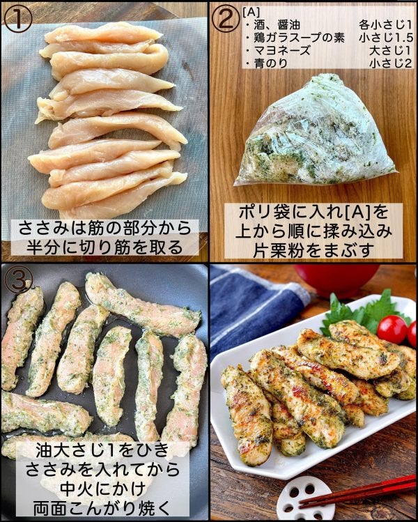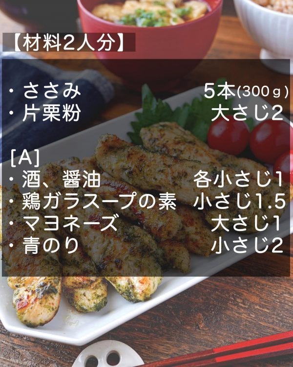 海苔の風味がたっぷりでしっかり味付きのささみは、ご飯のおかずにぴったりです。