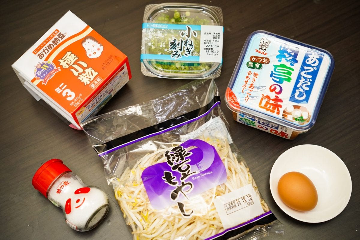 必要な材料は納豆1パック、卵1個、もやし100g、味噌大さじ3、味の素9振り、小ネギ適量とかなりシンプル。ちなみにもやしは一袋入れた場合、具材モリモリになるがとくに支障はないとのことだ。