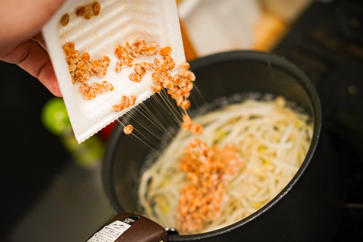 納豆は加熱により酵素は失われてしまうものの、それ以外の豊富な栄養素は摂ることができるそう。一気に納豆の香りが漂うが、気にせず味噌と味の素を追加。
