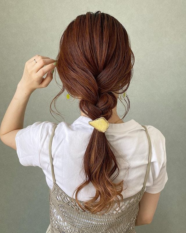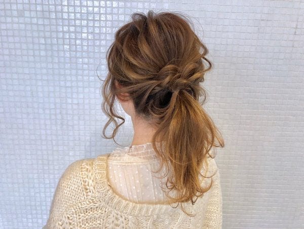 一つ結びにしたら毛束を巻きつけ固定し、ほぐすだけで完成なのでセルフでもできます。