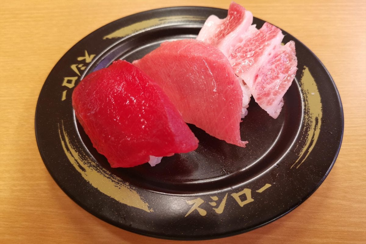 そして極めつけは黒皿(感動皿)の、天然本鮪3貫盛り(大とろ、中とろ、赤身)。見た目だけで「これが360円ってマジかよ!」と驚く良質なまぐろだ。