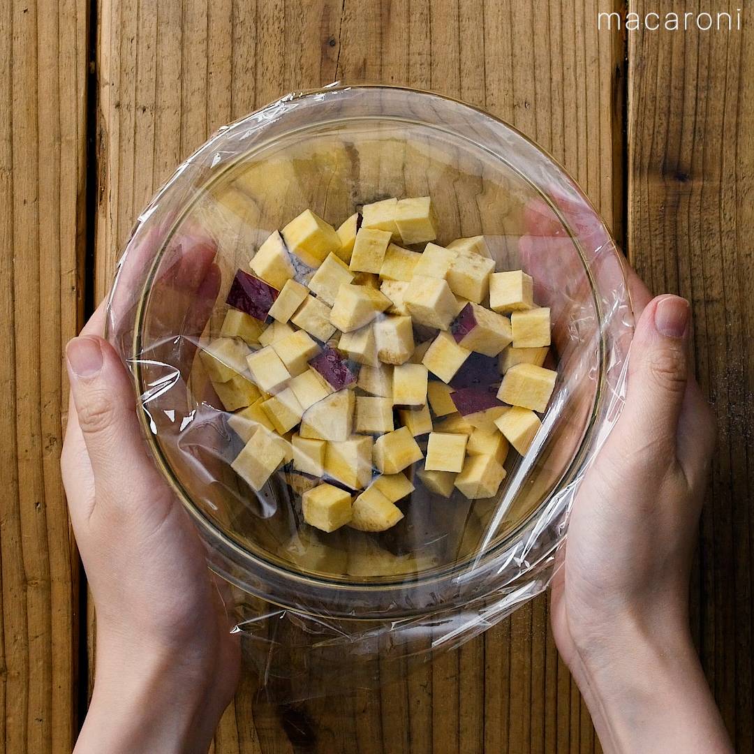 水気を切ったさつまいもを耐熱ボウルに入れ、ふんわりとラップをかけてレンジ600Wで3分加熱します。