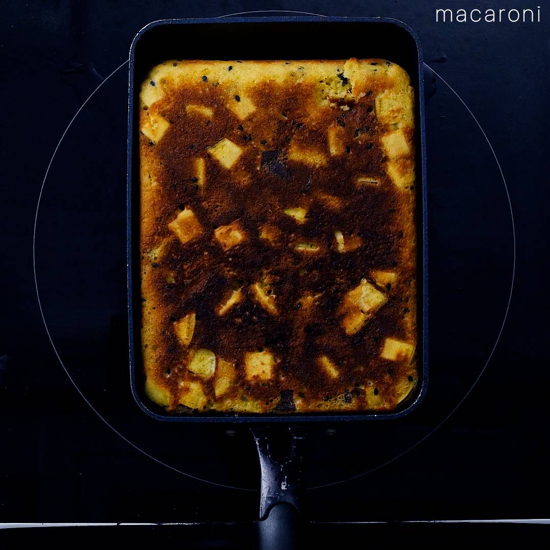 アルミホイルでフタをし弱火で10〜15分焼き、裏返して2〜3分焼きます。粗熱が取れたら、食べやすい大きさに切って完成です。