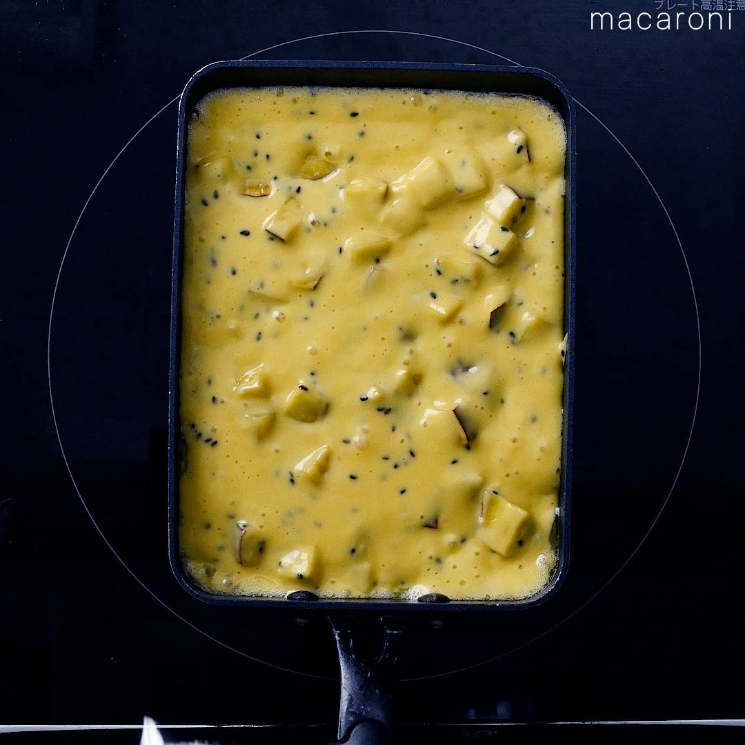 卵焼き器にバターを溶かし、③を流し入れます。