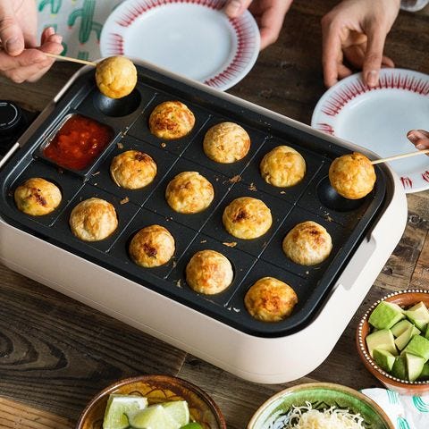 定番のたこ焼きも楽しいですが、こちらはタコミートやアボカド、チーズを入れて作るアレンジ料理で、サルサソースを添えていただきます。