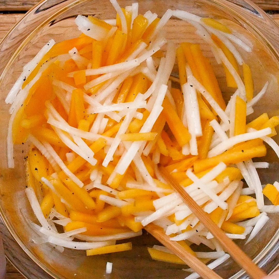 ・大根は皮をむき、5cm長さの細切りにします。
