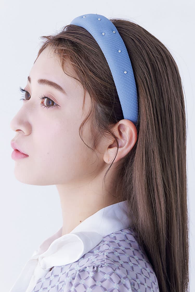 前髪をセンター分けにしてカチューシャをつける。ヘアアイロンを根元から挟んだら内→外巻きにしてゆるやかなウェーブをつける。