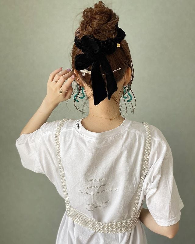 こちらは作ったお団子にリボンを巻き付けてあげることで、崩れにくくてより華やかなヘアアレンジを作っています。